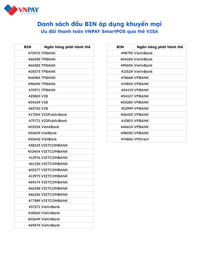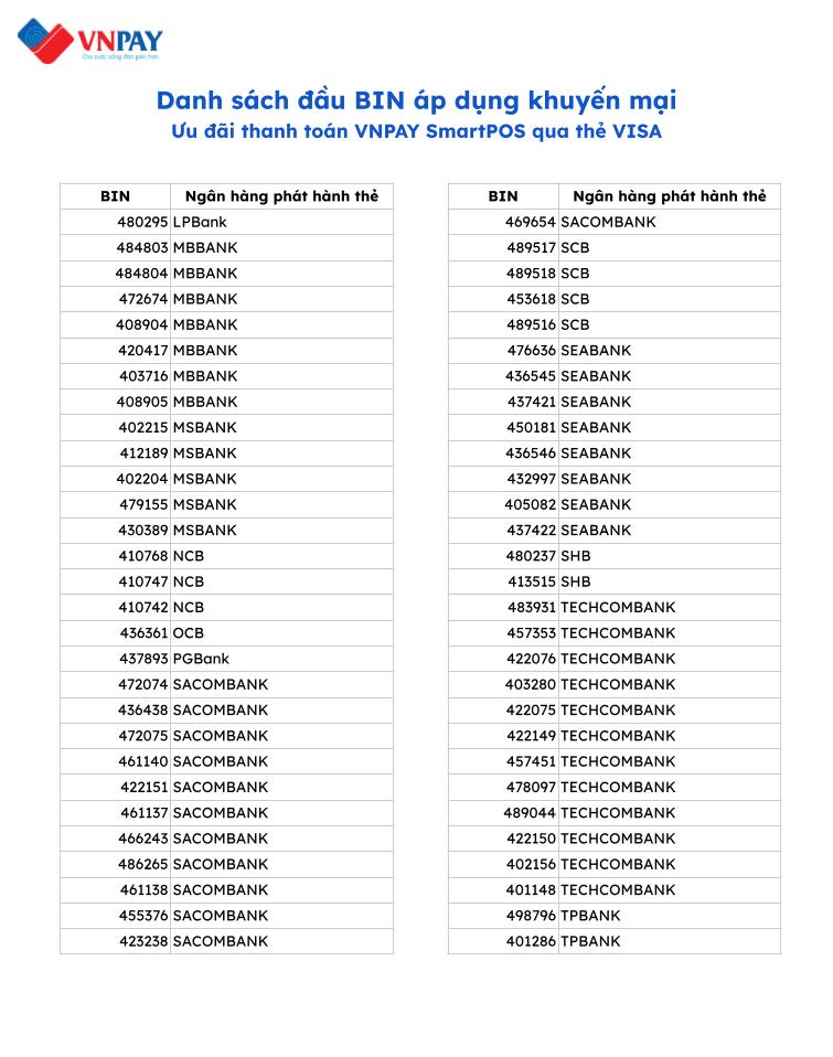 Danh sách đầu BIN áp dụng khuyến mại: