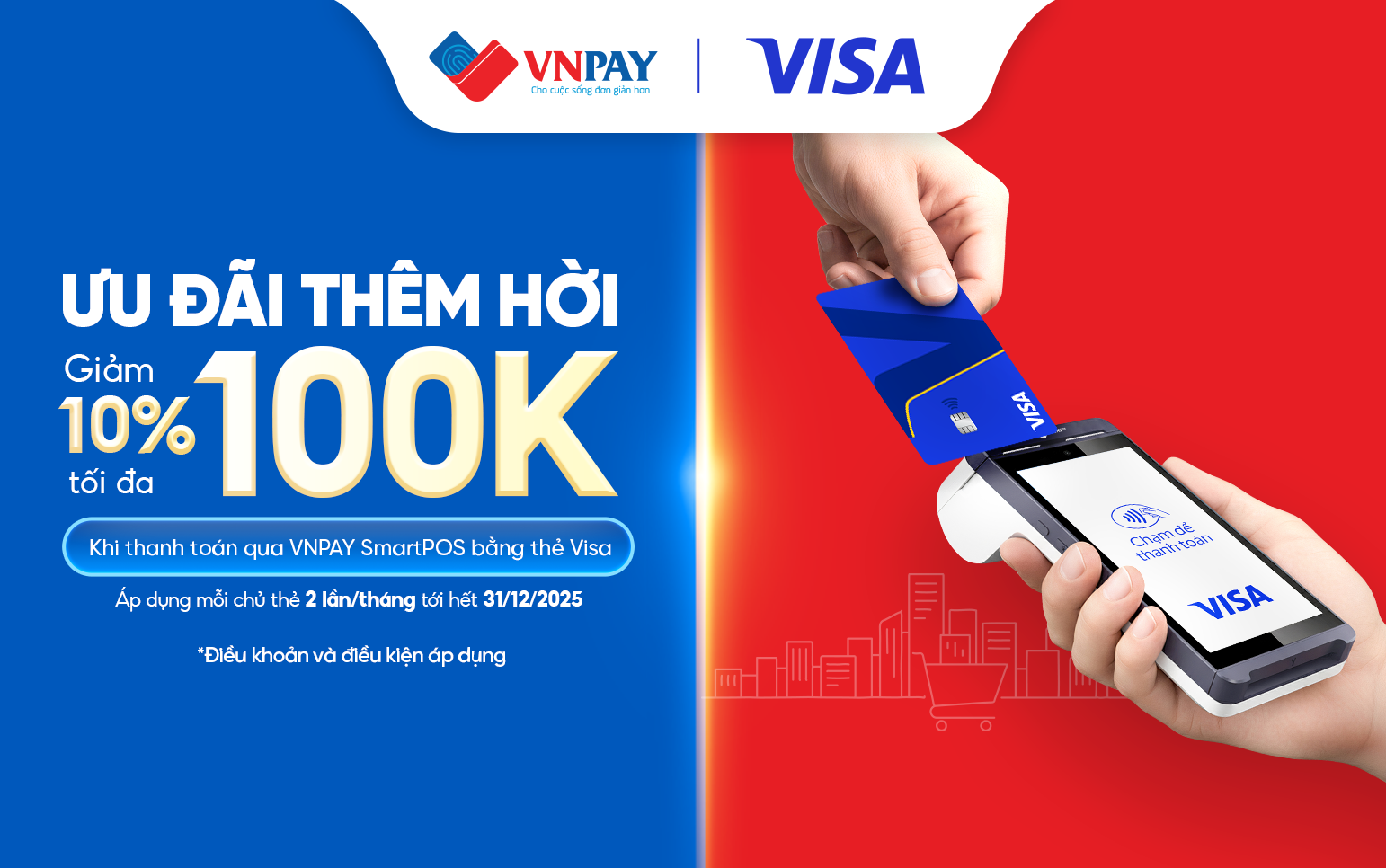 2. Nội dung ưu đãi: Chủ thẻ Visa (ghi nợ, tín dụng, trả trước) phát hành tại Việt Nam khi thanh toán bằng thẻ vật lý qua VNPAY SmartPOS tại cửa hàng tham gia chương trình sẽ được giảm trực tiếp 10% tối đa 100.000đ